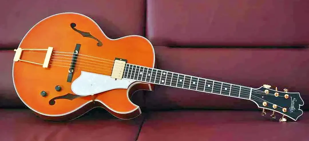 Der Tonabnehmer produziert den fetten, warmen und für Archtops typischen Ton. Die spezielle Deckenkonstruktion der Brigit-Bauweise gibt dem Klang aber noch einen schönen, akustischen Anteil, der dem Ton Transparenz verleiht.