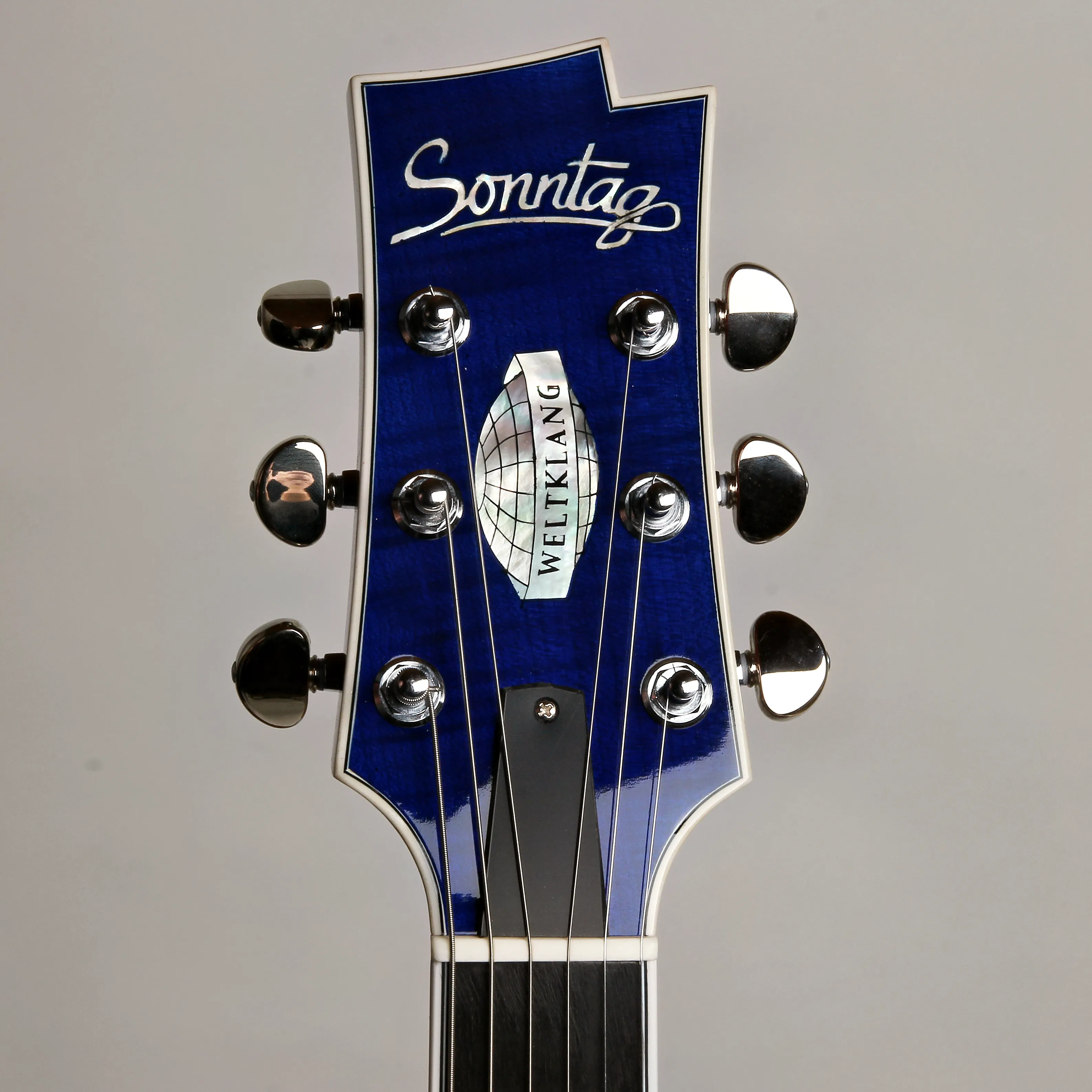 Die ebenso elegante wie dynamische Kopfplatte der „Weltklang“ ist eine Ausnahme im Sonntag-Portfolio. Zusammen mit dem eigentümlich geformten Schlagbrett und der Kopfplatten-Einlage bildet sie eine Remineszenz an die Aufbruchstimmung im Nachkriegsdeutschland der 50er Jahre und die nationale Gitarrenbaukunst dieser Zeit. Ein durchaus extravagantes Instrument, das in die Zukunft blickt, ohne seine Wurzeln zu vergessen.
