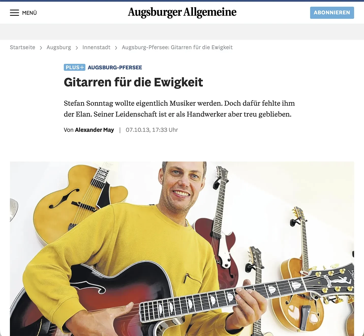 So, endlich bin ich berühmt! Die Augsburger Allgemeine hat mein Schaffen mit einem schönen Artikel von Alexander May in der Ausgabe vom 7. Oktober 2013 gewürdigt. Nach fast 20 Jahren Sonntag Gitarrenbau in Augsburg wird es ja auch mal Zeit, von der Öffentlichkeit wahrgenommen zu werden …