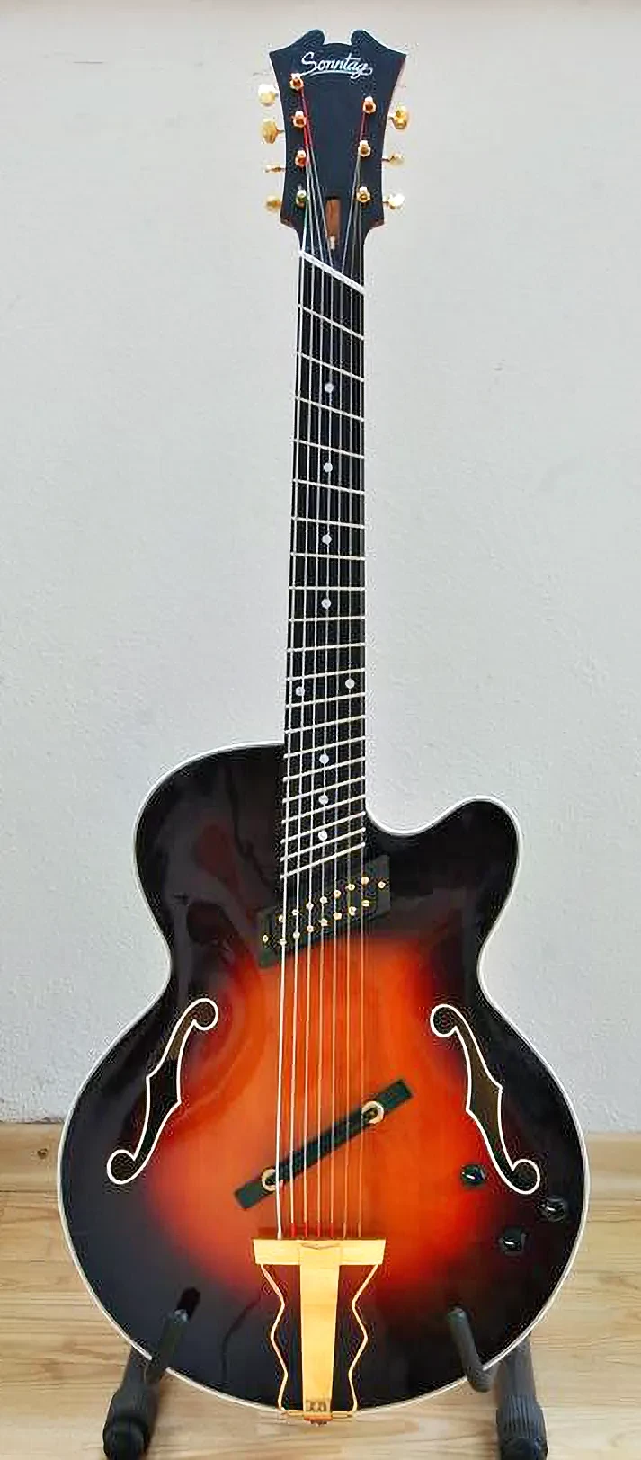 Aber nein, Spaß beiseite. Der Umbau von Uli Hoffmeiers siebensaitiger J16H Ballade ist durchaus geglückt. Uli Hoffmeier wollte einen neuen Hals mit gefächerten Bünden auf dem Griffbrett ausprobieren. Bei diesem System haben die hohe e-Saite und die tiefste Bassaite unterschiedlich lange Mensuren, in diesem Fall 63 cm und 70 cm. Daraus ergeben sich die schräg stehenden Bünde.