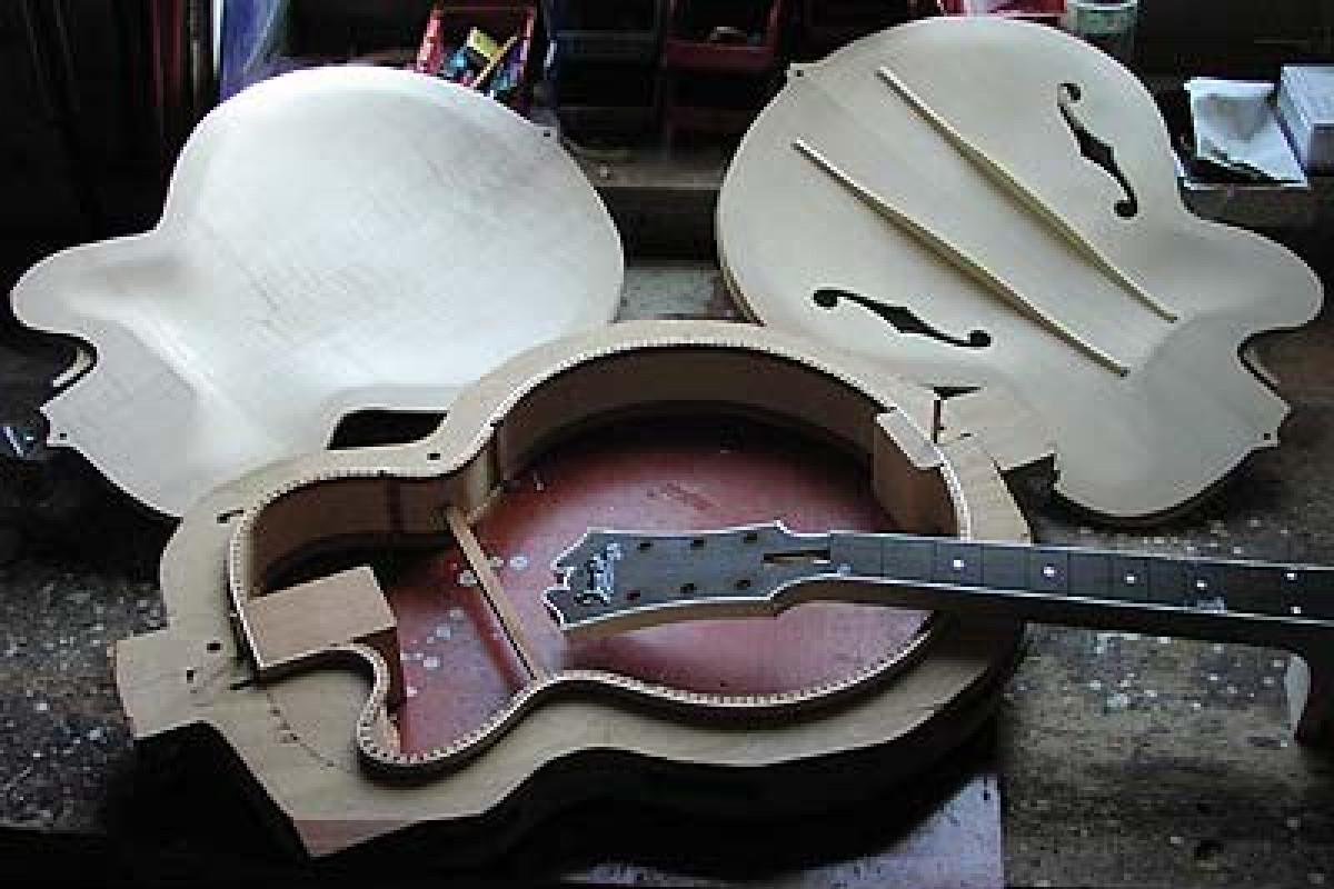 Seit 1993 stelle ich in meiner Werkstatt Archtop-Jazzgitarren in Handarbeit her. Für diese Instrumente verwende ich nur massive, in meinem eigenen Lager luftgetrocknete Hölzer, die dort über einen Zeitraum von mindestens fünf Jahren lagern dürfen. Für alle Modelle verwende ich Alpenfichte für die Decke und Bergahorn für Boden, Zargen und Hals. Meine Gitarren gibt es wahlweise mit zwei verschiedenen Decken-Bebalkungssystemen.