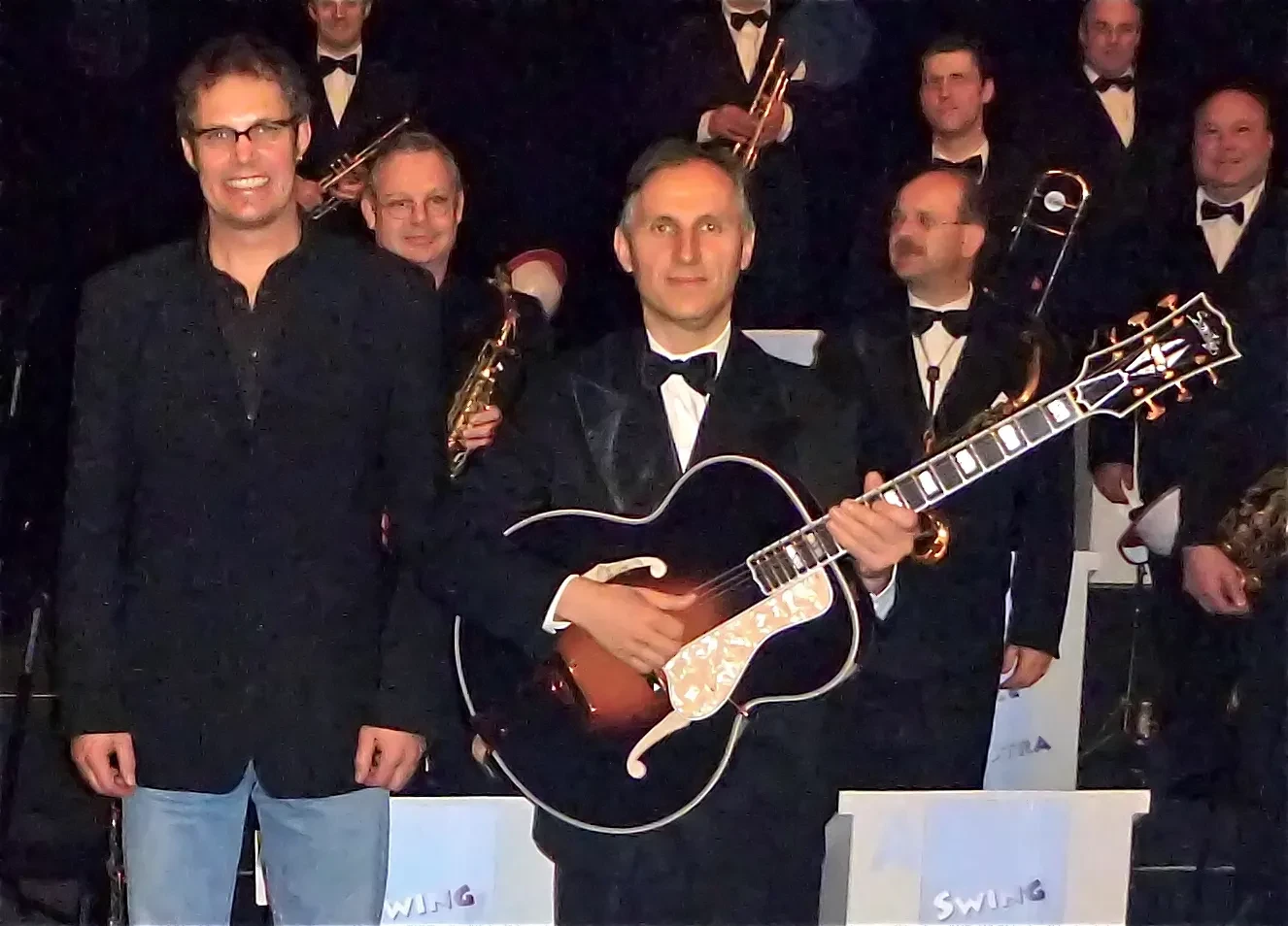 In Berlin ist das Swing Dance Orchestra“ unter der Leitung von André Hermlin zu Hause. Dieses feine Orchester praktiziert den Swing so wie weiland die Big Bands in den 30er, 40er Jahren. Also unverstärkt und mit authentischen Instrumenten. Das heißt für den Gitarristen daß er sich mit seiner Gitarre gegen den Klangteppich der restlichen Band akustisch durchsetzen muß, nur mit Hilfe seiner Spieltechnik und einer Gitarre die diese umsetzen kann.